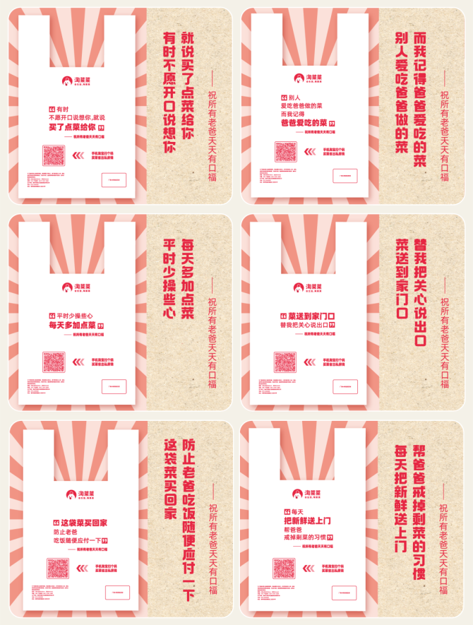 消費者除了物質需求,還有情感需求。刺激打動消費者的情感,也能夠驅動購買。而價值共鳴是提煉賣點最高級的用法,是情感需求的升級版。價值共鳴能夠聚集一批消費者,共同為某個價值點努力。而你的產品借助價值點能夠獲得這群消費者喜愛。例如父親節期間,淘菜菜推出了百萬個帶有花式文案的創意塑料袋到各地團點。通過這些文案的輸出,用戶買的不再僅僅是菜了,更是一份對家庭、對父親的愛。