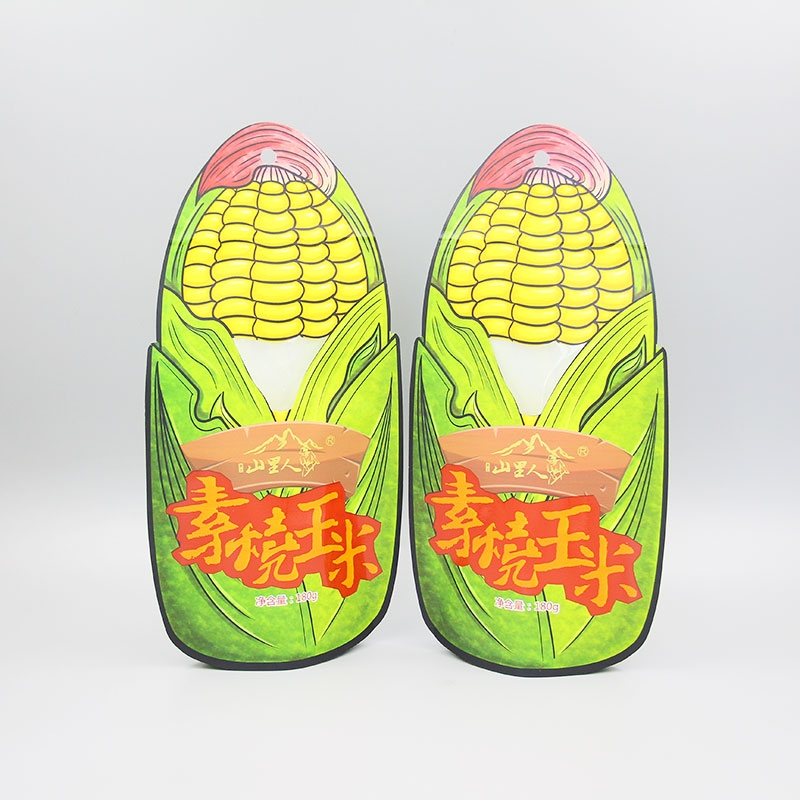 本產品為啞光油白牛皮紙揩開窗異形袋,牛皮紙密封性好,平整度高,手感更加細膩,成袋挺括,白牛皮紙底色是白色,不會與其他顏色疊加,因此印刷效果好。袋子設計成玉米的形狀,具有新穎、簡單、明確、好識別、凸顯品牌形象等特點。拉鏈設置在背面,保證正面圖案完整。